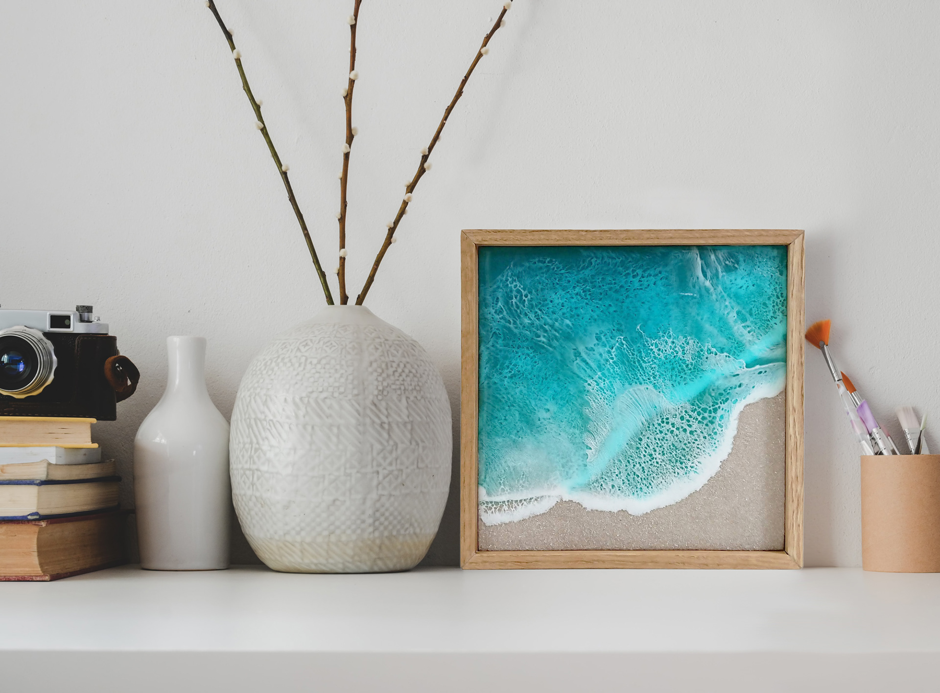 Het strand schilderij is gemaakt met epoxy en echt zand. Door de transparante eigenschap van de epoxy zie je het zand op de zee bodem liggen. Hierdoor krijgt het strand schilderij een realistische look.
