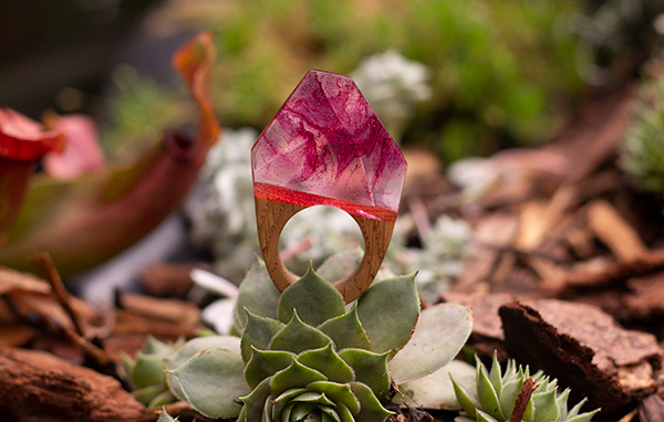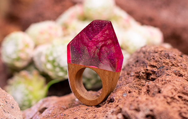 Deze handgemaakte houten statement ring heeft een diamant vorm met een roze wolk erin. This handmade wooden statement ring has a diamond shape with a pink cloud in it. Are you interested? Contact me for more info: wietske.koelma@gmail.com